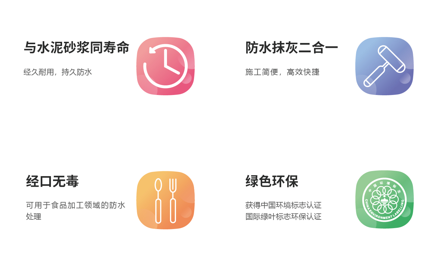2、为保证防水质量,除水泥、砂以外,本品不得与其他任何材料混合使用。