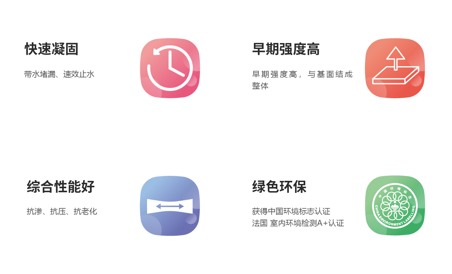 适合带水堵漏、速效止水施工,也可用于厨卫间、地下室、屋面、阴阳角、管道周边等部位的快速修补及加强处理