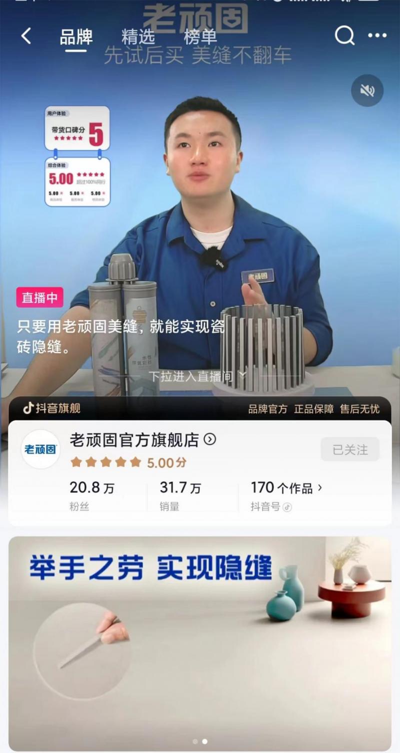 不到一年的时间,它实现了在抖音平台上的“一骑绝尘”,登上家装美缝品类的销量顶端,成为了众多同行竞相模仿和追赶的对象,更是引领了瓷砖隐缝的家居美学新潮流。