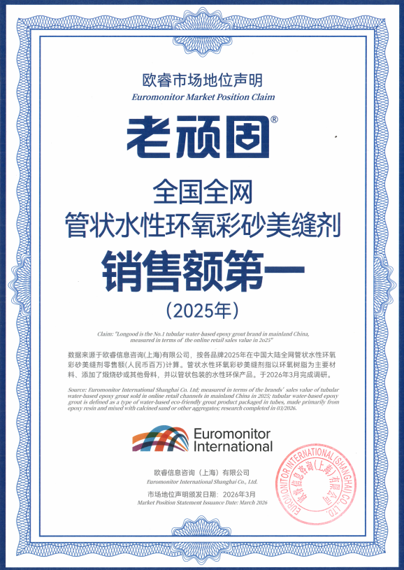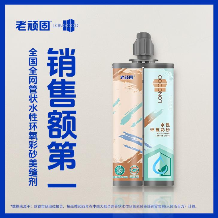 近日,市场认证结果出炉:“全国全网管状水性环氧彩砂美缝剂销售额第一(2025年)”。继2024年上半年之后,老顽固再次蝉联这一美缝品类冠军。